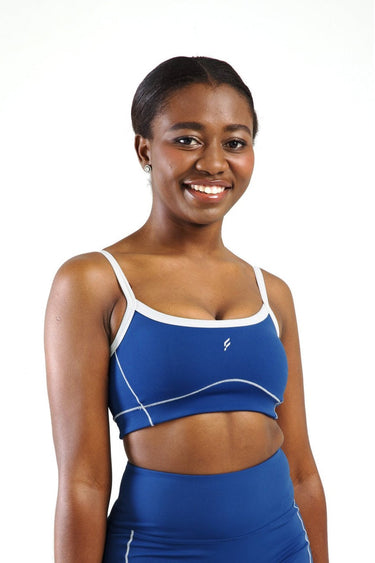 Streetwise Edge: Cropped length pairs with high-waisted leggings; Electric blue + white contrast trim highlights sculpted back for gym-to-street impact.